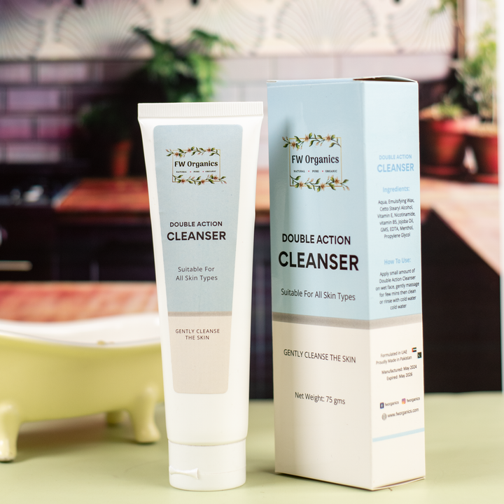 Meet the FW Organics Double Action Cleanser – Pakistan’s top-rated 2-in-1 face wash that gently removes dirt, oil, makeup, and pollutants while deeply hydrating your skin. Formulated with organic botanicals and antioxidants, it’s ideal for both oily and dry skin, balancing your complexion without stripping it of natural oils.